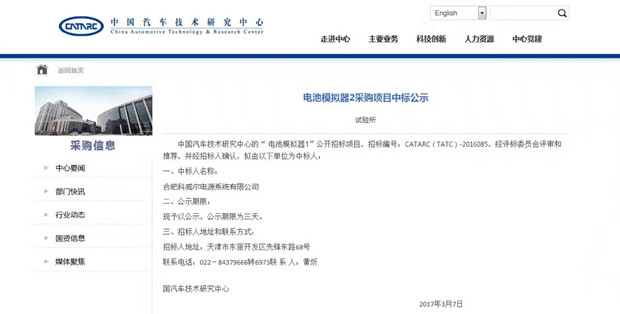 中国汽车技术研究中心2017年3月7日公告,合肥乐鱼电源系统有限公司中标中国汽车技术研究中心“电池模拟器2”(招标编号:CATARC(TATC)-2015085)、“电池模拟器3”(招标标号:CATARC(TATC)-2015086)项目。