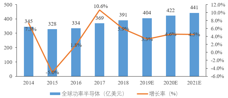 根据 IHS Markit 预测, 2021 年市场规模将增长至 441 亿美元,2018 年至 2021 年的年化增速为 4.09%,2018 年工业应用市场占全球功率半导体市场的 35.08%,汽车领域占比 23.55%,其次为通讯和消费电子领域。随着对节能减排的需求日益迫切,功率半导体的应用领域正在从传统的工业领域和 4C 领域逐步进入新能源、智能电网、轨道交通、变频家电等市场。