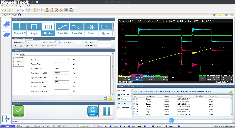 Kewell MX300D系列IGBT动态测试系统能够为IGBT提供完善的动态参数测试解决方案,具备对IGBT开通特性、关断特性、二极管反向恢复特性、短路特性和栅极电荷特性的测试功能。IGBT动态测试系统设计参照IEC60747-9-2019、GBT 29332-2012等功率半导体测试测试标准,采用高精度示波器配合低杂散电感治具的方案满足IGBT动态测试各项指标的要求。测试系统主回路杂散电感<35nH,单个测试项测试时间<0.3s。同时该系统具备测试区外置方案,能更好的配合和融入自动化产线,提升IGBT批量化生产的测试效率。