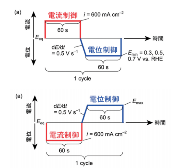 图2.1.8-1 模拟电解槽启停的水电解加速老化试验协议(上图:阳极,下图:阴极)