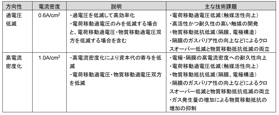 表1.5.3-3 提高水电解系统性能、耐久性的前提条件( AWE )